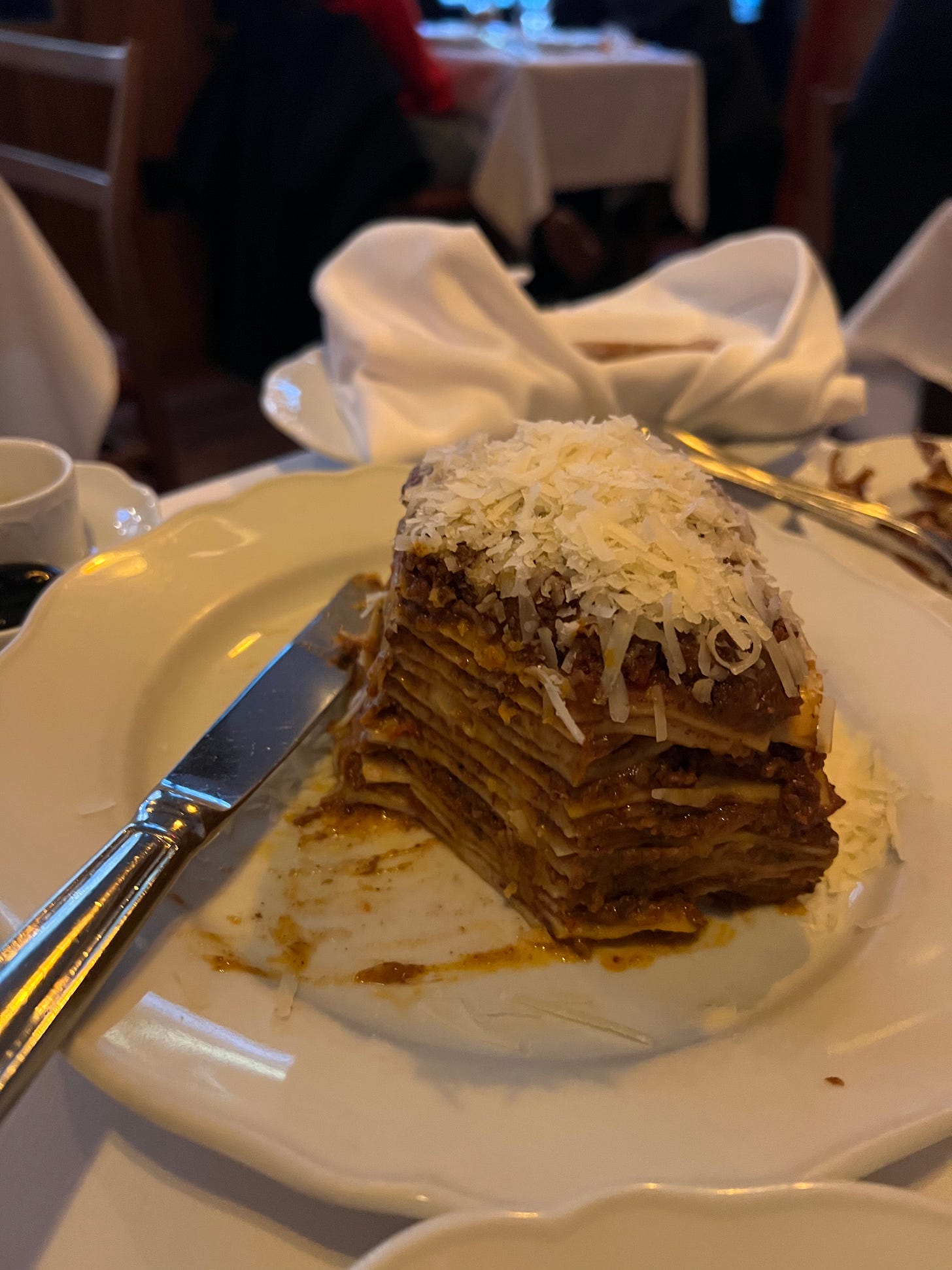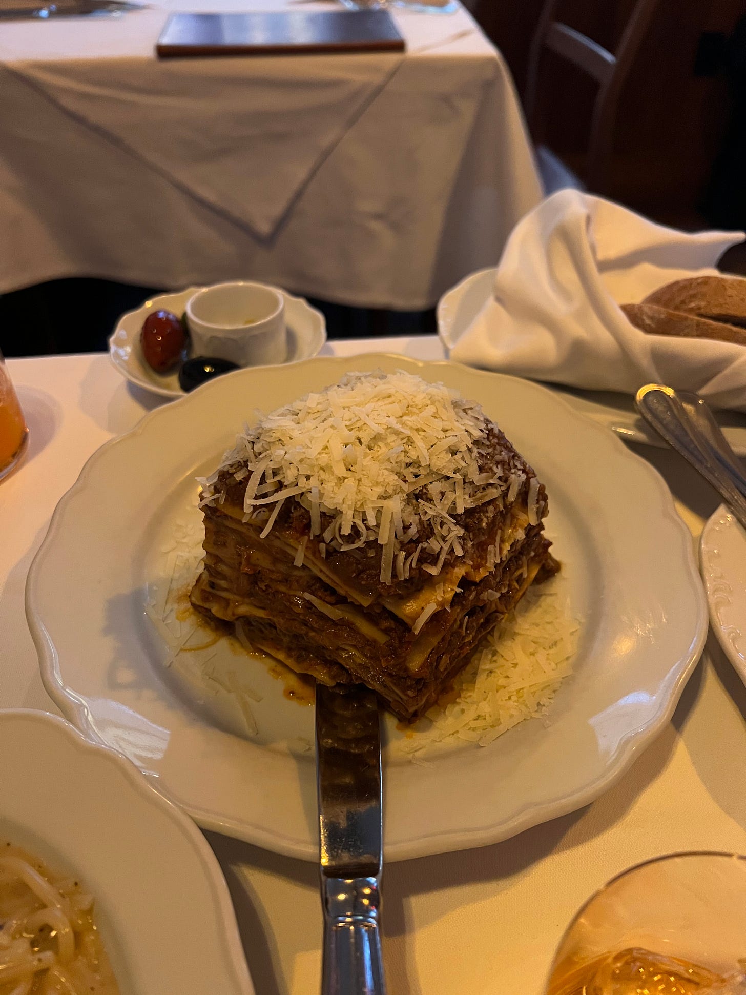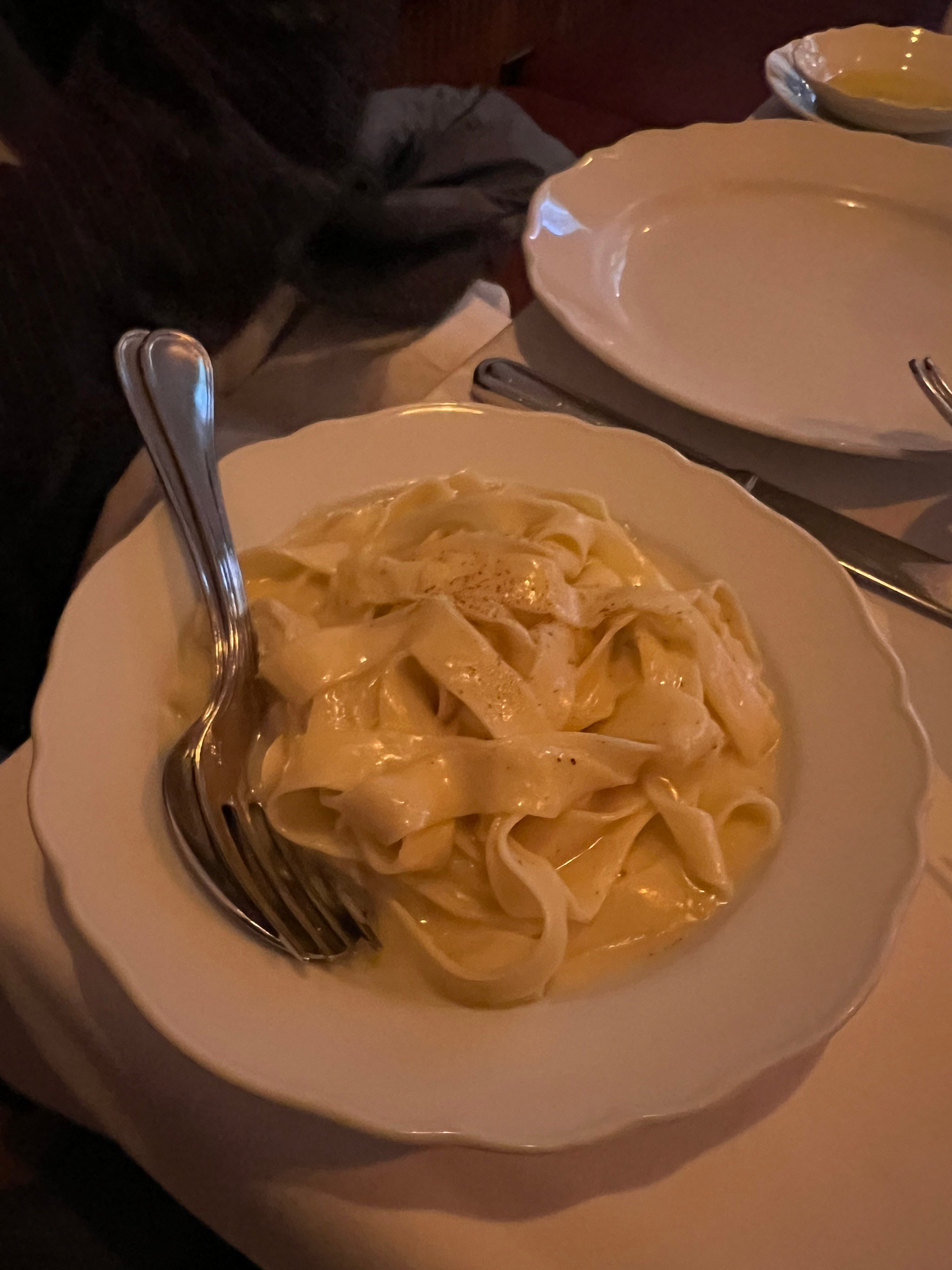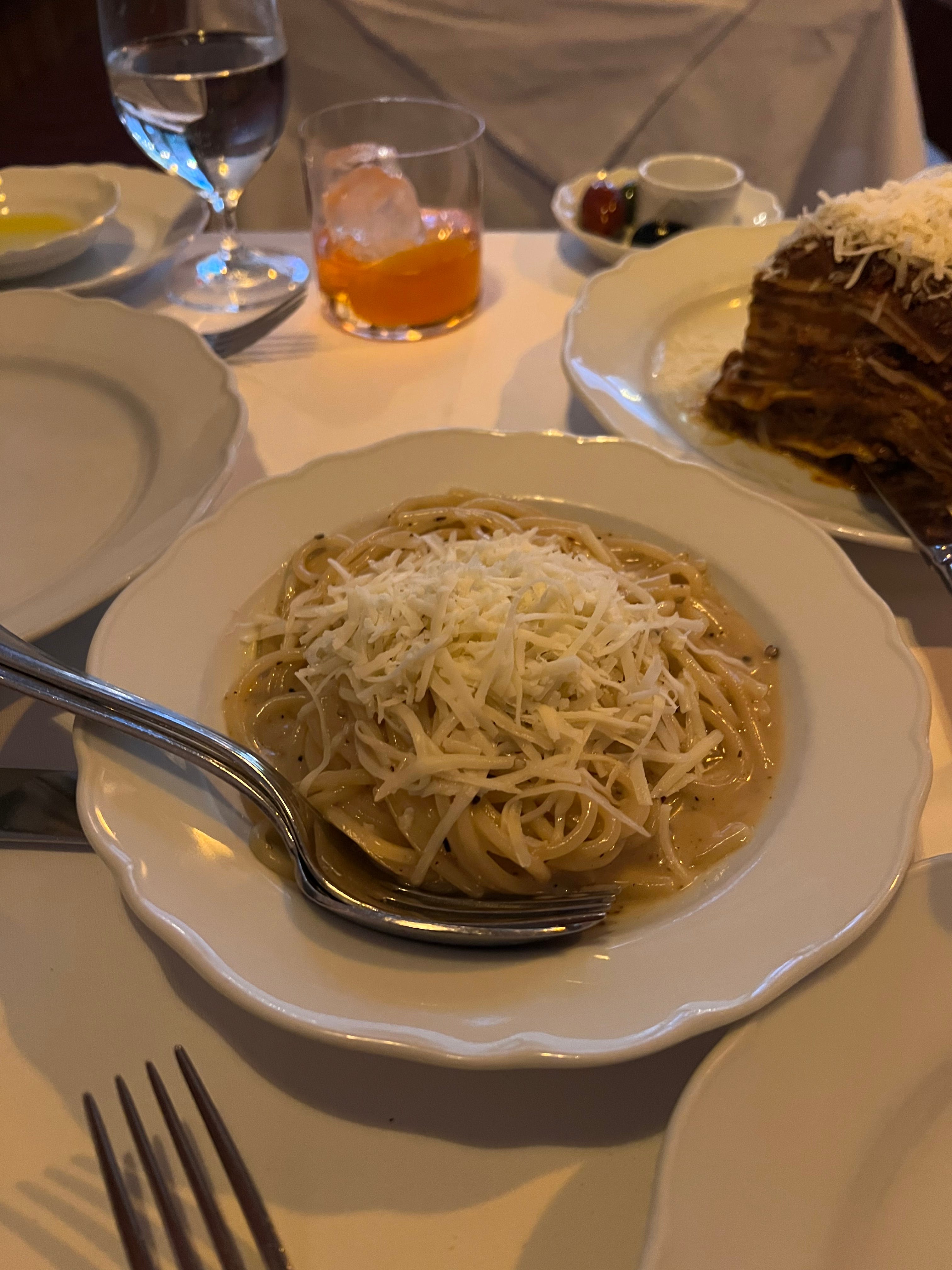 Entrées: As is normally the case when I venture to a restaurant that has been on my list—and therefore thoroughly researched—we kind of already knew what we wanted to order. We went with three pastas: Papardelle Al Limone, Lasagna A Sugo, and Cacio E Pepe. Some of the specials seemed enticing, including the Porterhouse for Two, which a couple a few tables down ended up ordering with stares from the masses as it was placed on their table, but we knew that we would be full with all the food we were already ordering.